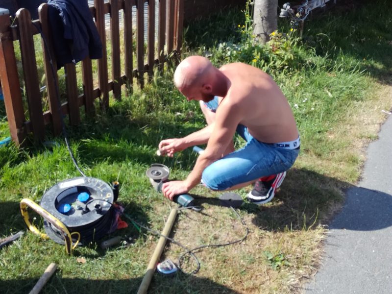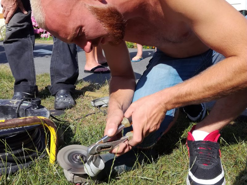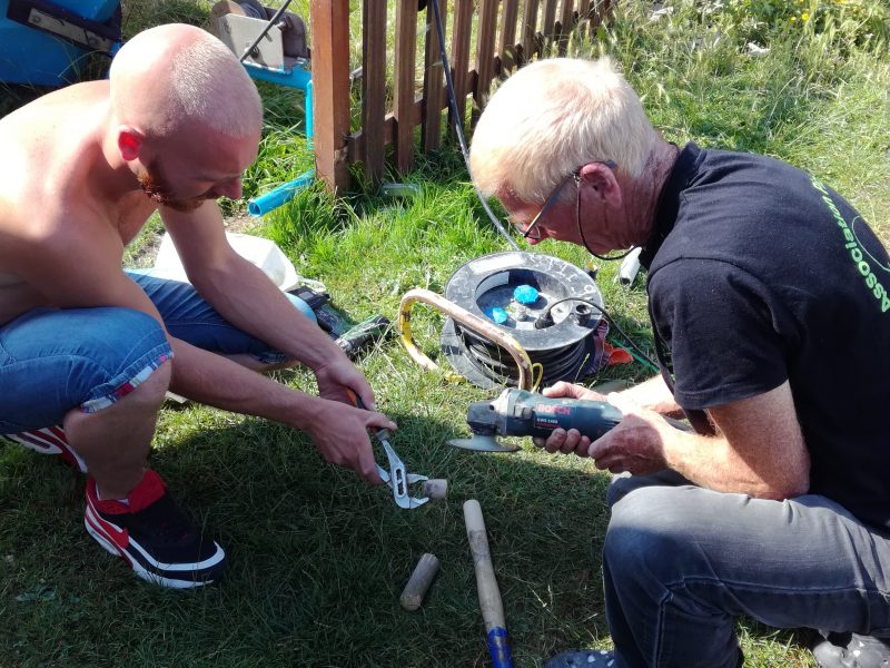 Le lendemain matin, dimanche, ils nous ont proposé de nous aider et ensuite ils ont voulu essayer de faire une réparation un peu plus solide pour pouvoir me permettre de rentrer à la maison en vélo (et pas en train….)