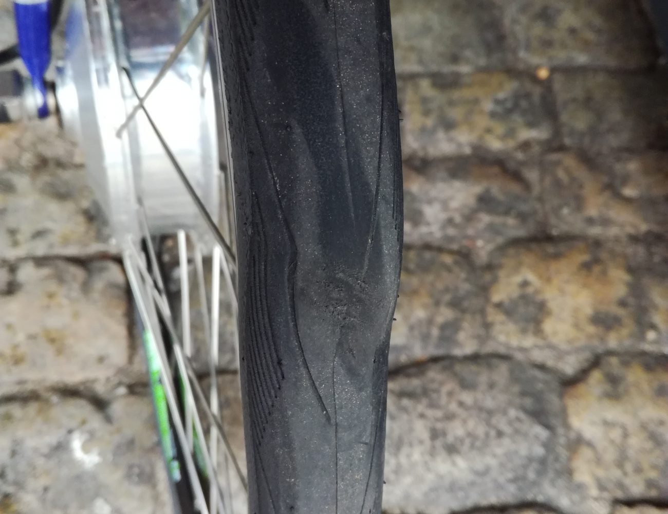 My front tire was dead....here you can see that the repair we made avoided the worst! Luckily I found a tire 'almost of the right size' (1 inch ,1)